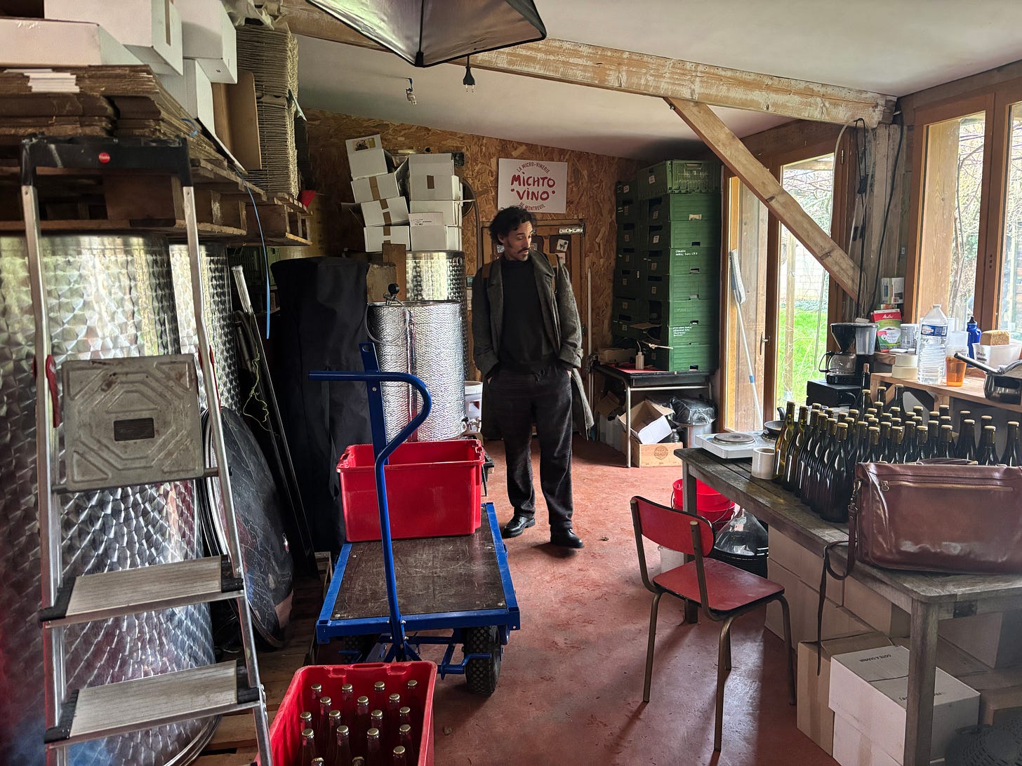 I recently visited my friend Florent Sabourin’s urban winery in Montreuil. ‘Michto’ is a gypsy word that means ‘good’ or ‘cool’ and is apparently still used in regular parlance in Montreuil. And the wines are good! I had already tasted most of them, having bought bottles from Florent over the past couple of years, but had not had the opportunity of visiting the winery.